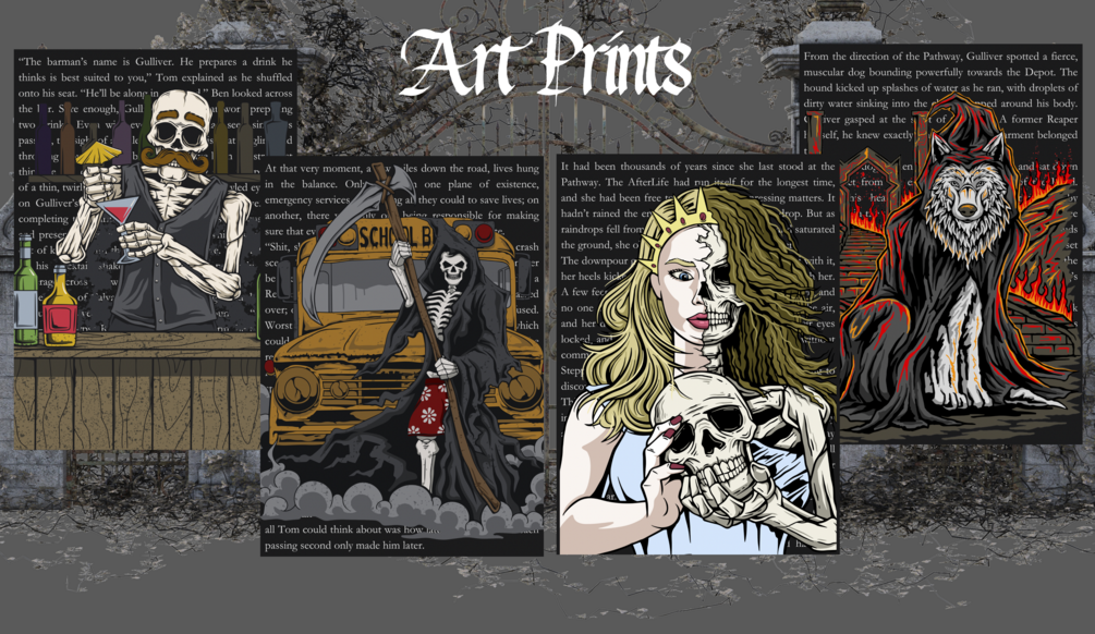 Each print showcases one character as drawn by Angga 'Pixelogan' Pratama as seen on the front and back covers of the series. The image is sent against words from the novels themselves by Mike Norris.